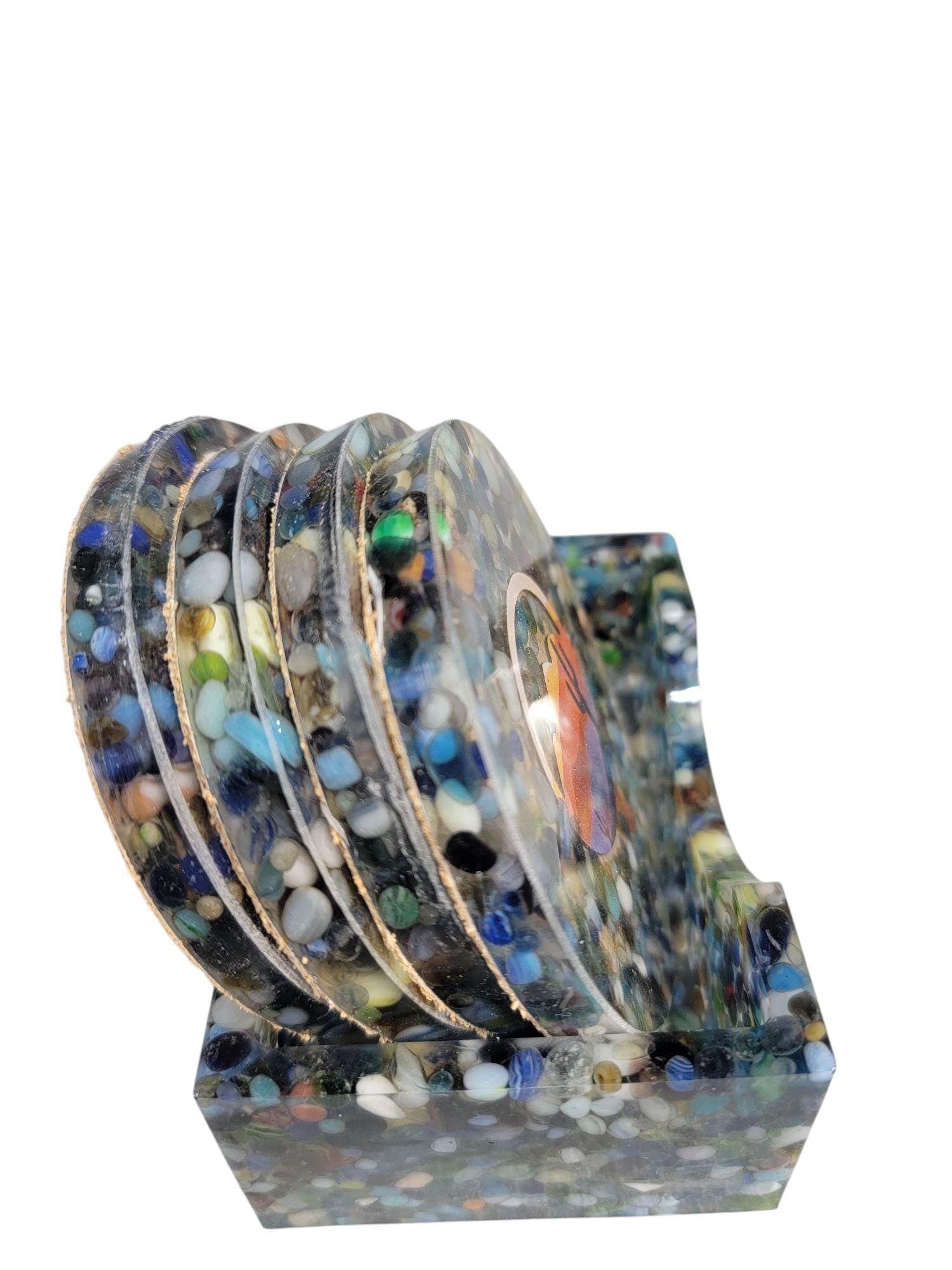 This is a set of 4 handmade drink coasters featuring a unique design made from natural glass chips embedded in resin. The coasters come in a variety of vibrant colors, creating a beautiful and eye-catching addition to any home decor. The set includes a holder to keep the coasters organized when not in use. Perfect for protecting your surfaces from water rings while adding a touch of coastal charm to your living space or entertaining area.