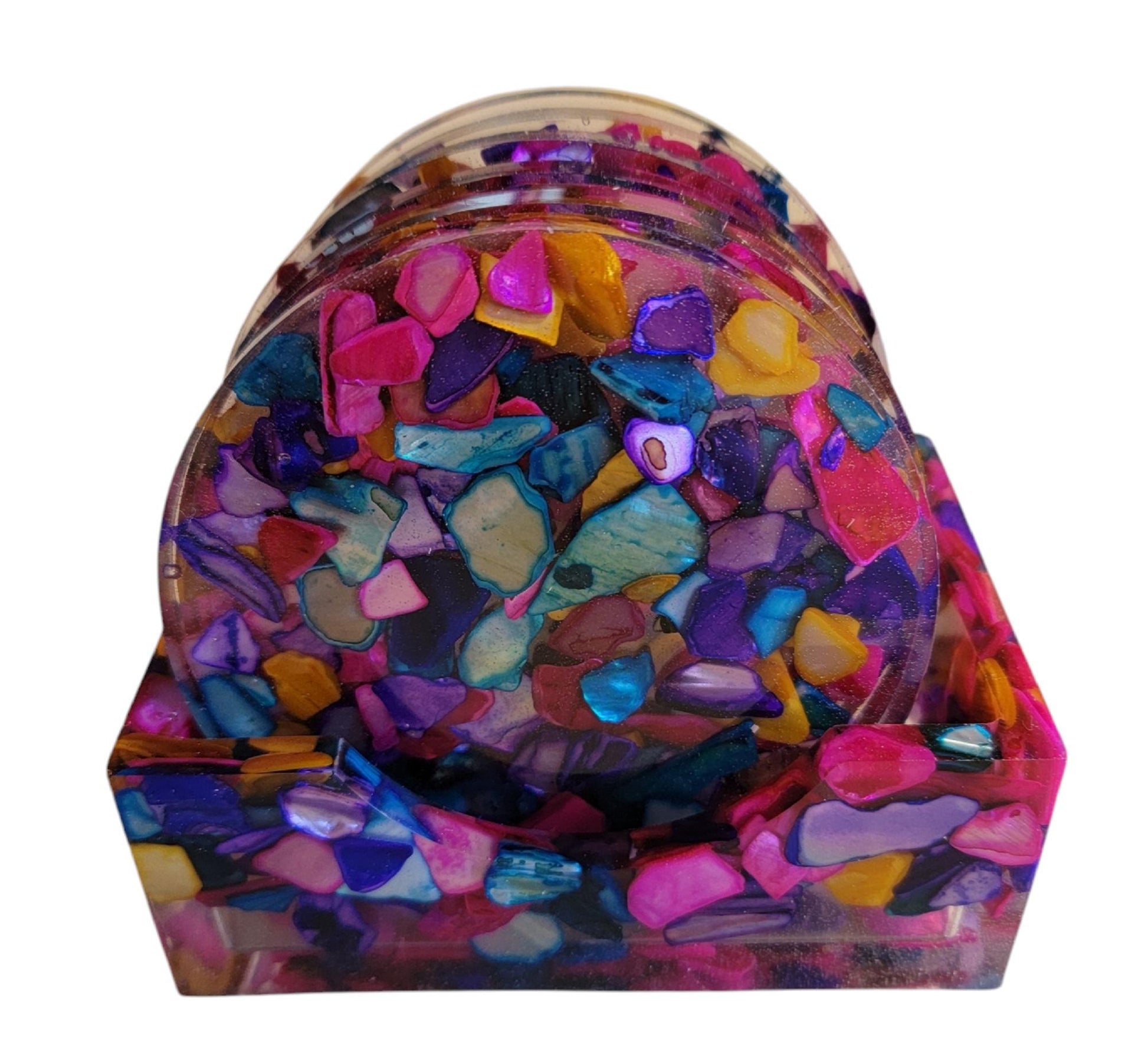 Set of 4 Coasters Multi Color Natural Seashell Chips and Resin Holder, Drink Coaster, Resin Coaster, Seashell, Wedding Birthday, Coaster Set