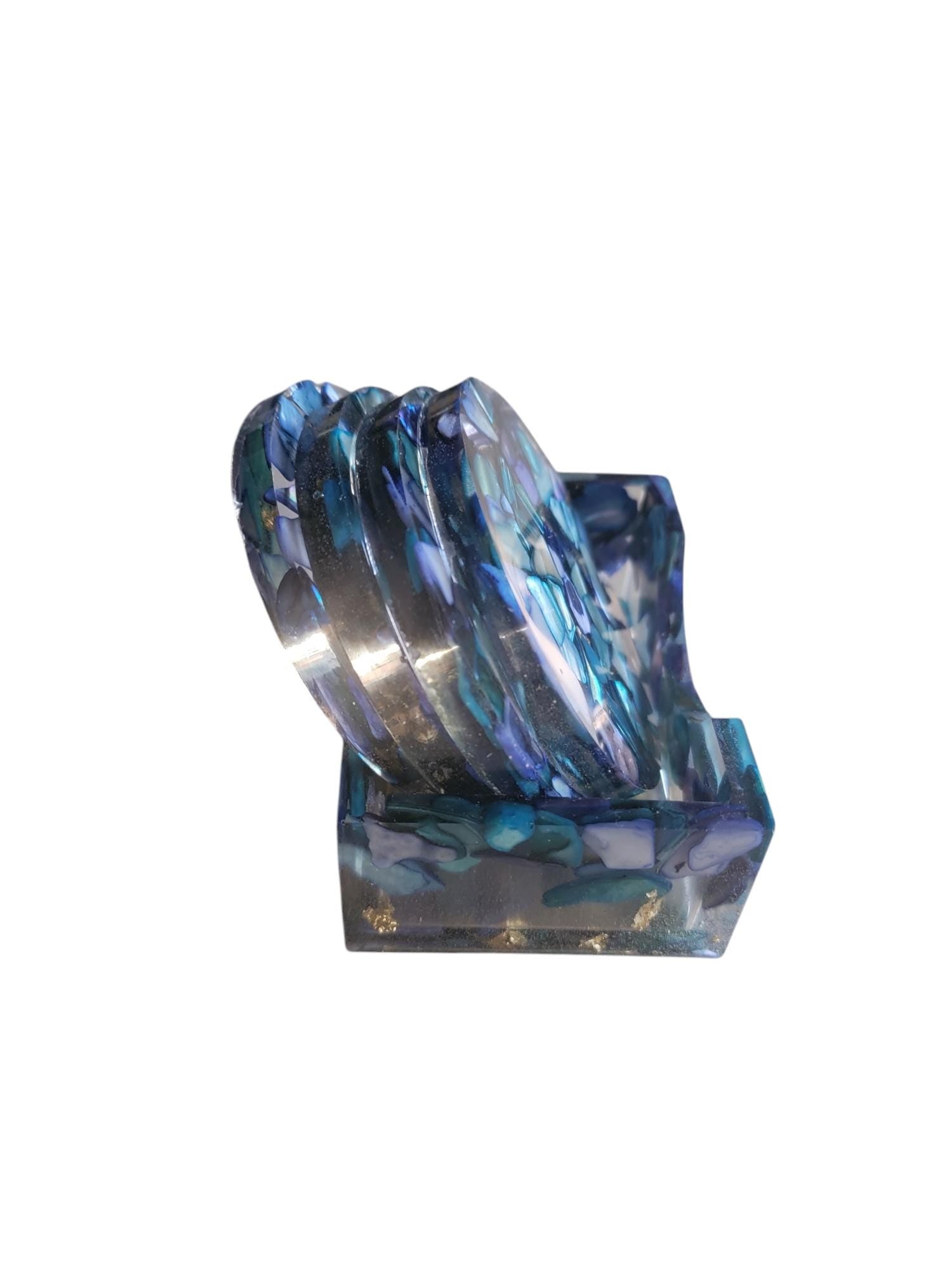 Set of 6 Coasters Blue Color Natural Seashell Chips and Resin Holder